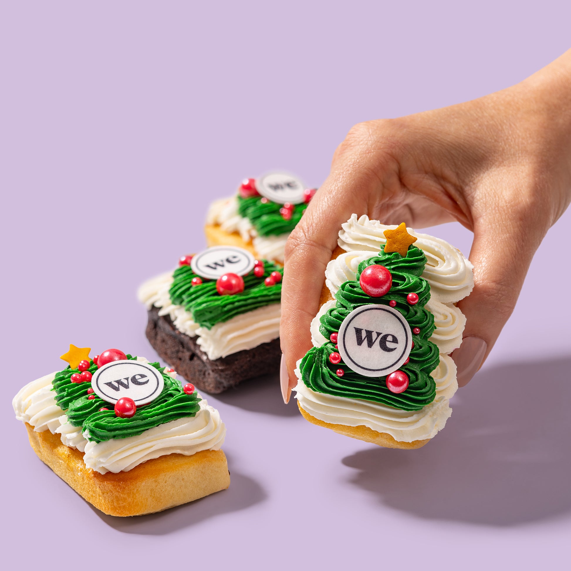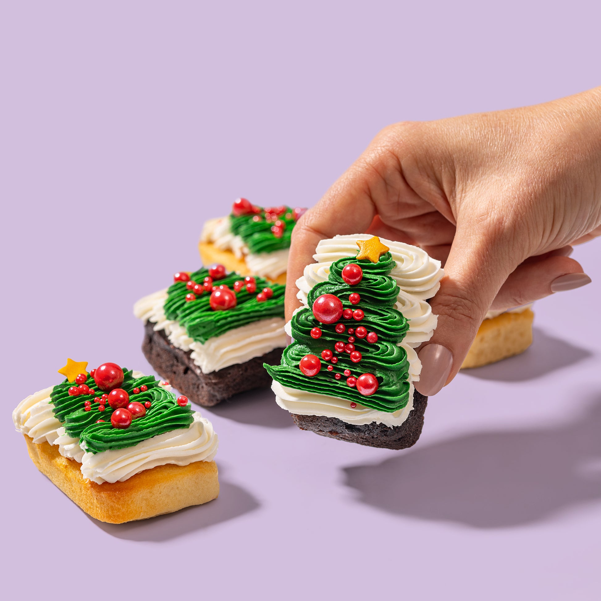 Make your office Christmas party or festive corporate event extra special with our Christmas Mini Loaf Cakes. Each vanilla sponge cake is elegantly frosted with a Christmas tree design and adorned with edible baubles. You can even add your logo for a unique branded touch.