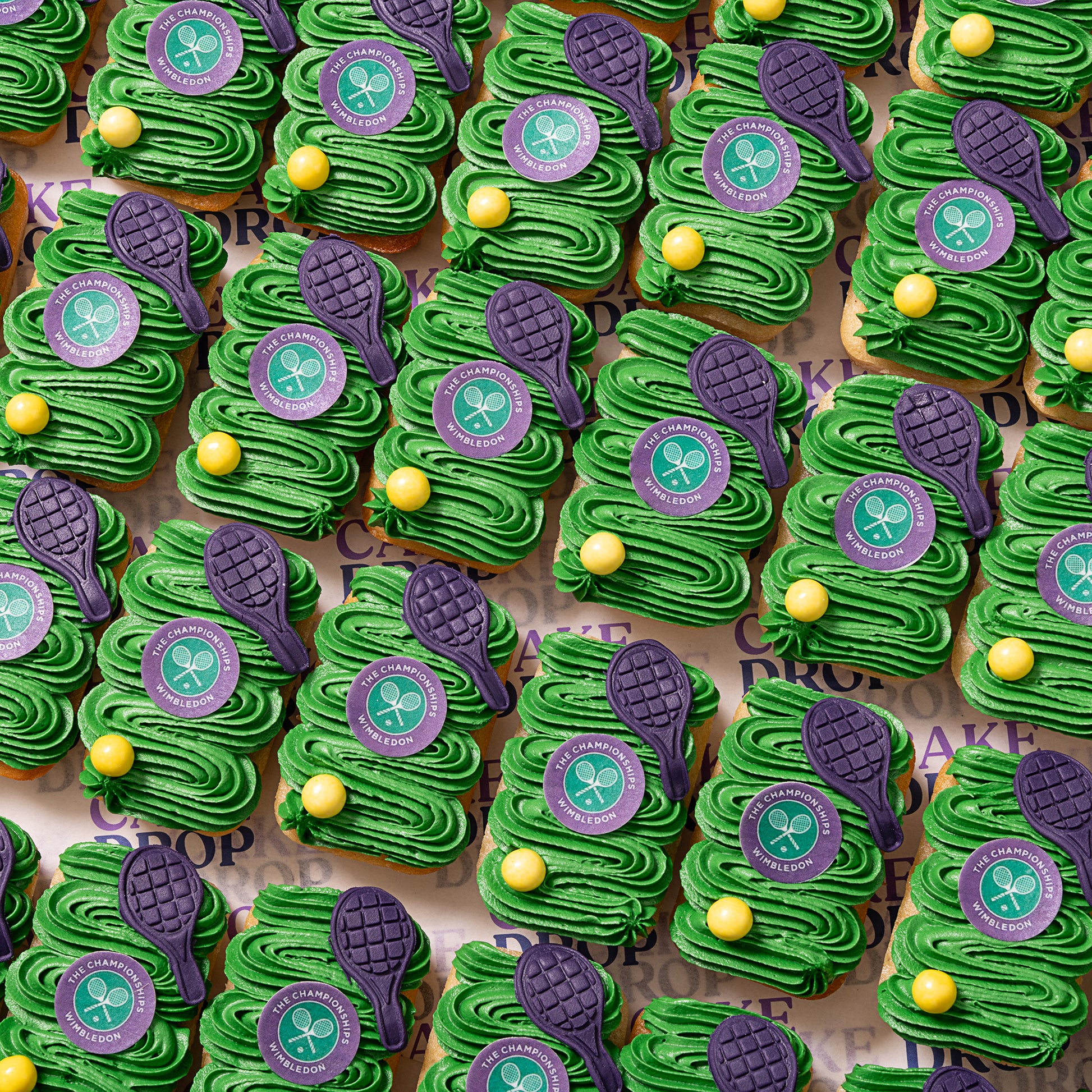 Mini loaves of vanilla sponge cake topped with green frosting, sugar tennis racket and ball decorations and logo/artwork toppers. These beauties come in trays of 50 and are impactful as a standalone treat or as part of a dessert table or canapé selection.